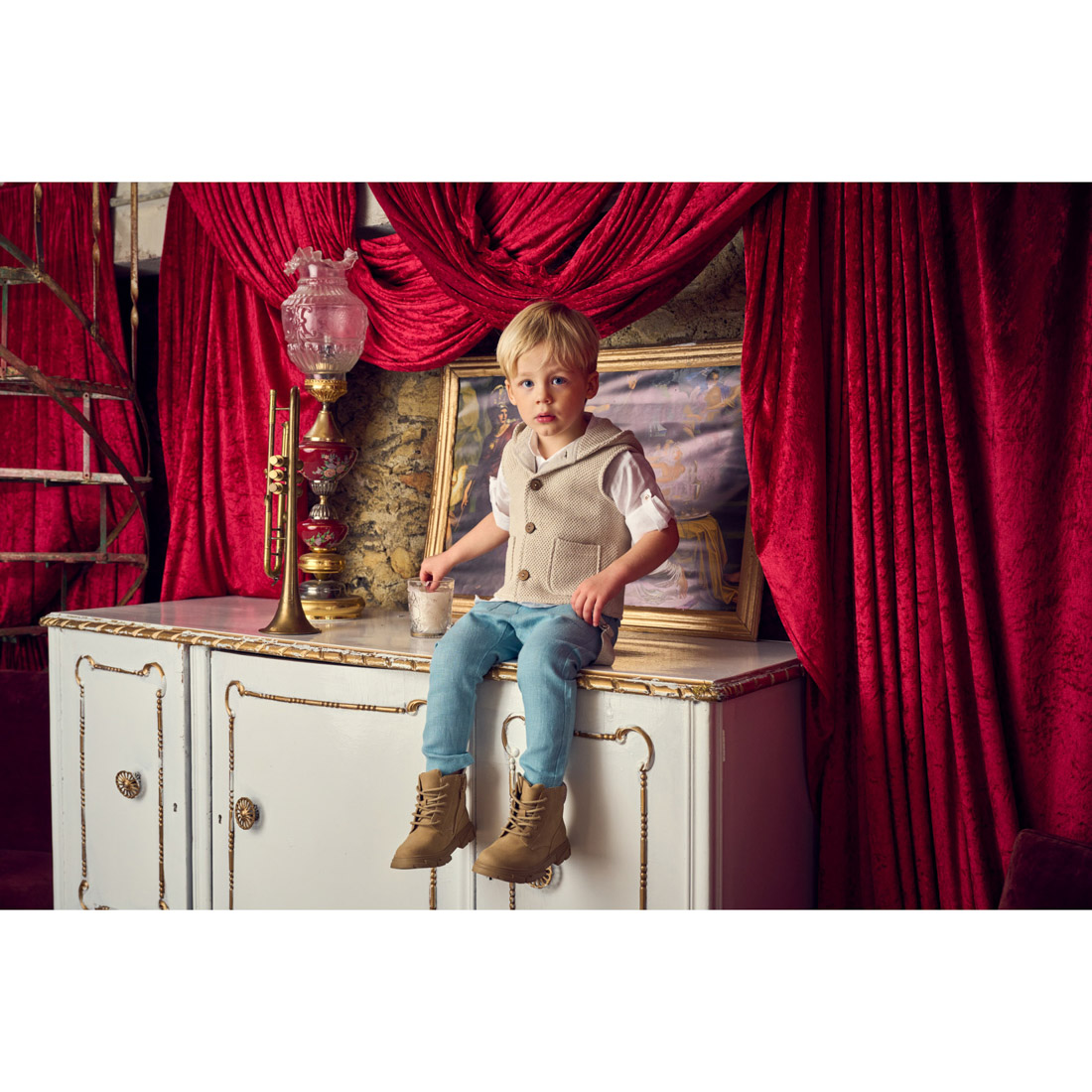 Βαπτιστικό σύνολο το οποίο αποτελείται απο αμάνικο πλεκτό γιλέκο με κουκούλα σε εκρού απόχρωση, λινό λευκό πουκάμισο και λινό παντελόνι σε πετρόλ απόχρωση. Το σύνολο αποτελείται απο τιράντες και καβουράκι.