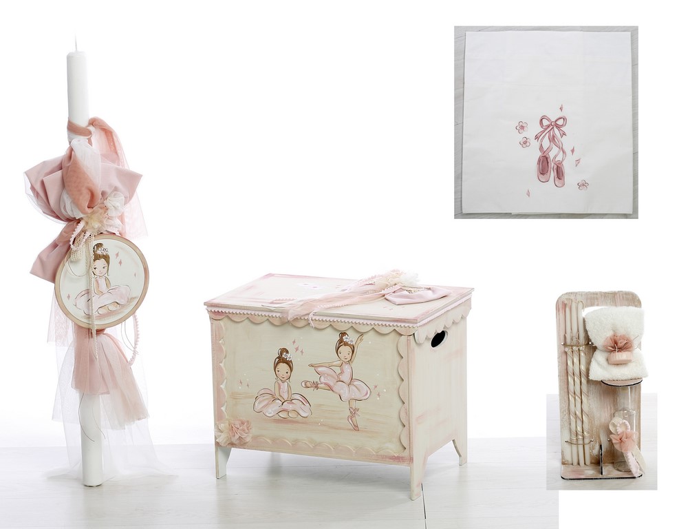 Με θέμα την μπαλαρίνα. Λαμπάδα με καδράκι μπαλαρίνα, σετ λαδόπανα ζωγραφισμένα με πουέντς, λαδοσέτ στολισμένο σε ξύλινο stand.